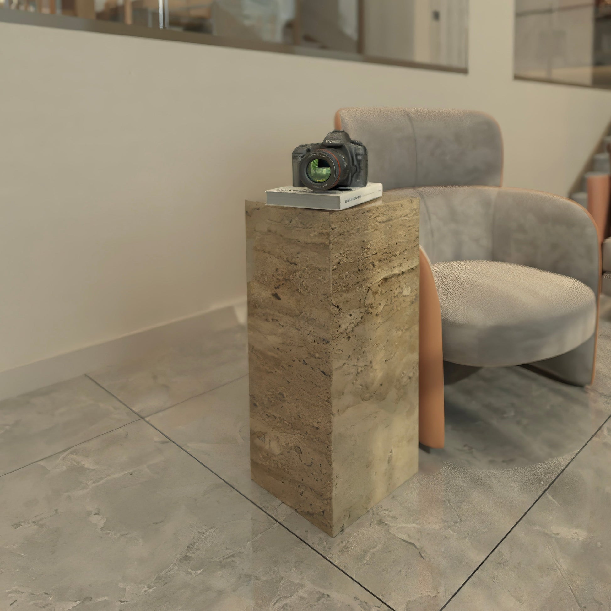 Beige Travertine Plinth Sofa SideTable – Natural Stone Elegance